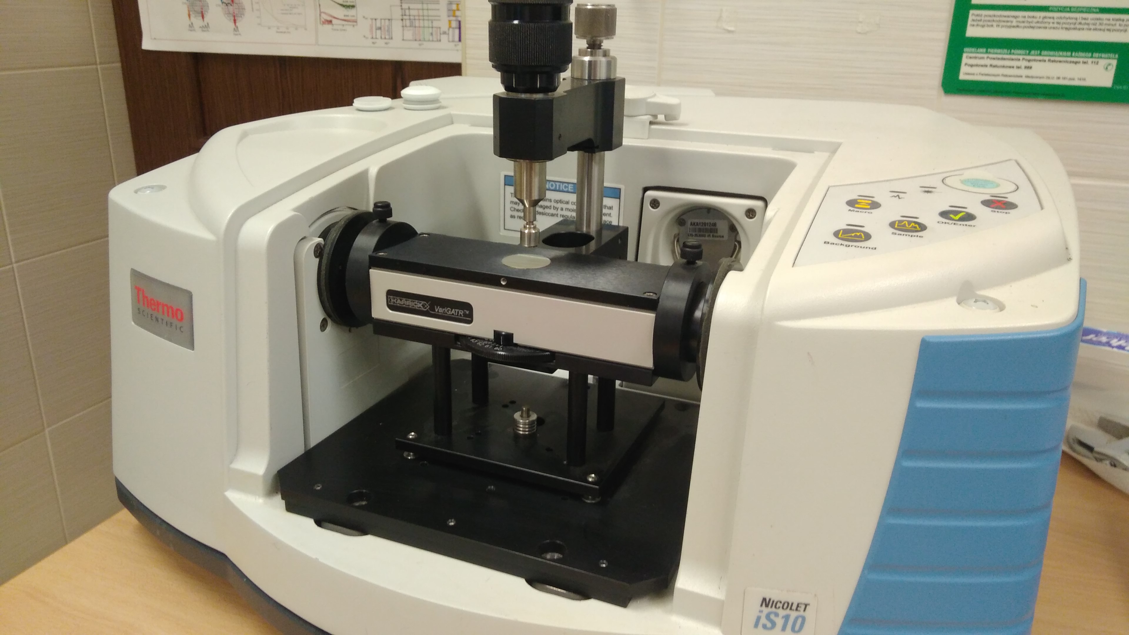 | The Nicolet iS10 FT-IR spectrometer (ThermoFisher Scientific) is a complete infrared spectroscopy system for routine analytical needs. The Nicolet iS10 delivers the highest confidence in the verification and identification of materials. Optimized for 7800-350 cm-1 spectral range, allows for IR absorbance measurements in the transmission configuration, for samples which can be deposited on transparent substrates or prepared as KBr pellets. Moreover, our spectrometer is equipped with the VariGATR grazing angle ATR accessory, allowing for absorbance measurements in Attenuated Total Reflectance configuration, which virtually requires no sample preparation. With this accessory, which uses Ge crystal with high refractive index, it is even possible to measure IR absorbance of single monolayers on semiconductor (e.g. Si) and metallic substrates. The VariGAT is excellent for rapid, repeatable measurements and provides at least an order of magnitude increase in sensitivity relative to grazing angle methods. |